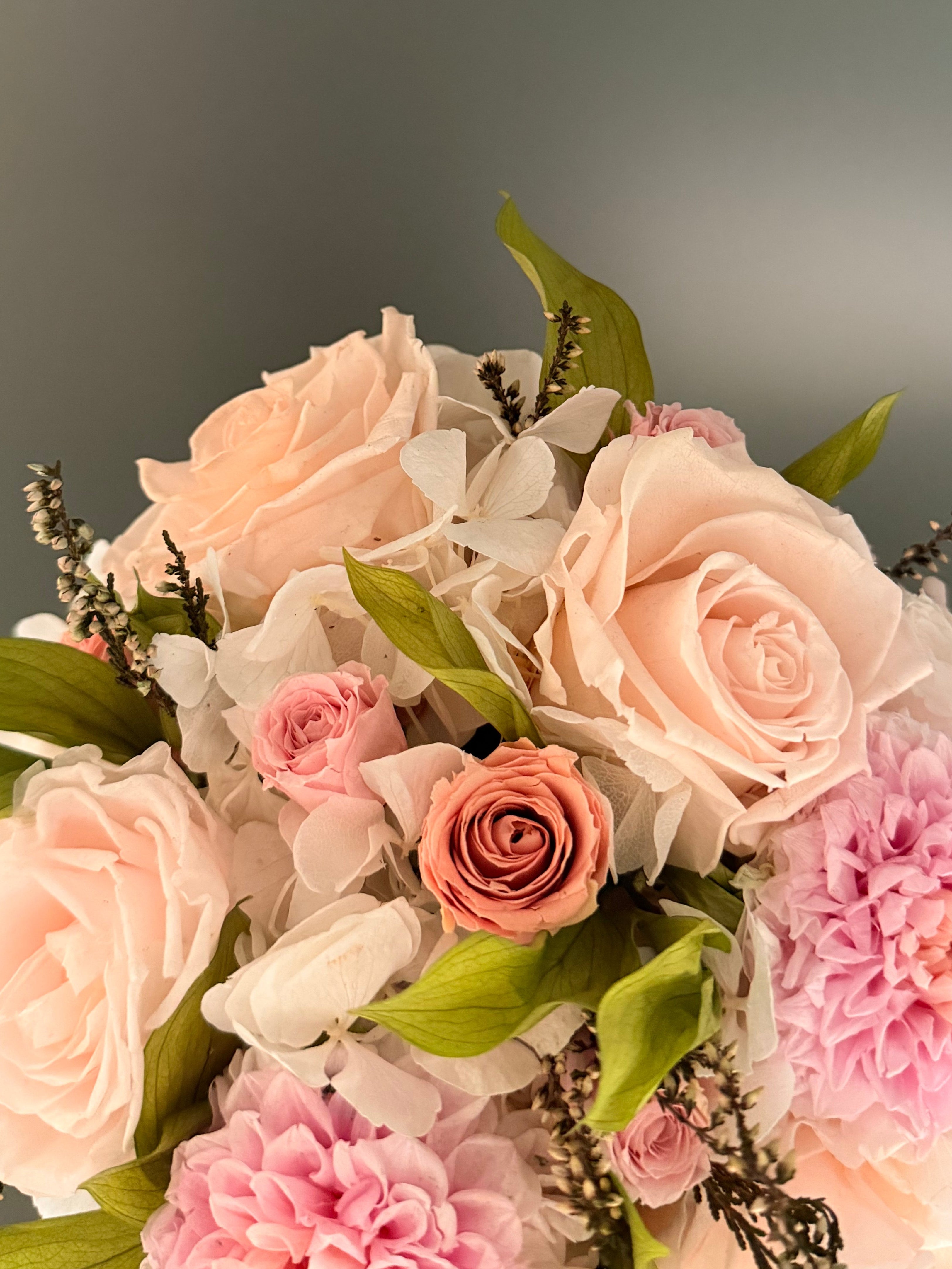 Ogni composizione è realizzata a mano, con attenzione ai dettagli e rispetto per la materia. Fiori veri, lavorati con cura che resteranno intatti per anni.